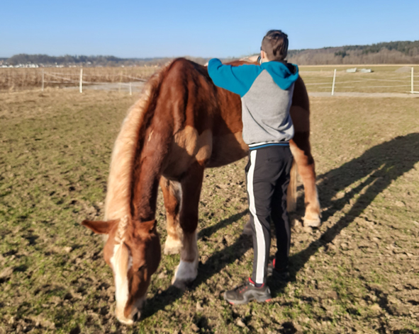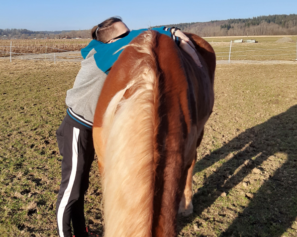 Dieser junge Mann leidet an einer Autismusstörung, die ihm im Schulalltag große Schwierigkeiten bereitet. Wir stärken durch das therapeutische Reiten das Selbstbewusstsein, das Einlassen auf andere Menschen und auch Tiere. Ebenso versuchen wir die Körperwahrnehmung und die Frustrationstoleranz zu verbessern.