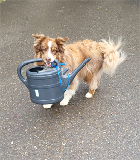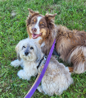 Chester (links) - Aussie-Rüde ist Aufpasser und Tierhüter. Er ist für das Blumengießen verantwortlich und wählt sehr genau aus, wer zu uns auf den Hof darf und wer nicht.